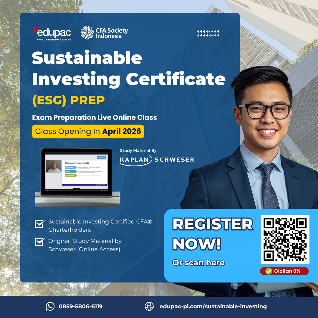 Edupac Financial Academy, bekerja sama dengan CFA Society Indonesia, menghadirkan program persiapan sertifikasi keuangan global seperti CFA® dan Sustainable Investing (ESG). Selain itu, Edupac juga menyediakan kelas persiapan khusus untuk FRM® agar peserta siap menghadapi ujian dengan percaya diri.