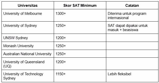 Banyak universitas Australia menerima SAT sebagai bagian dari aplikasi internasional.